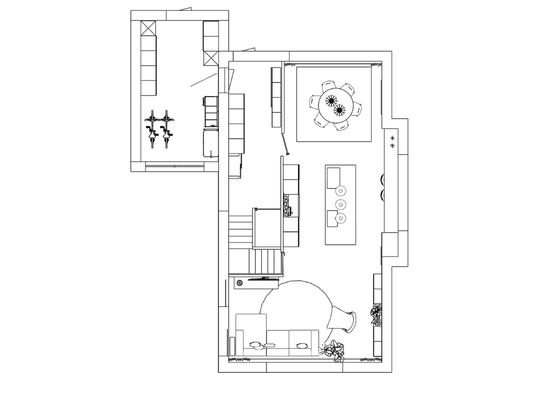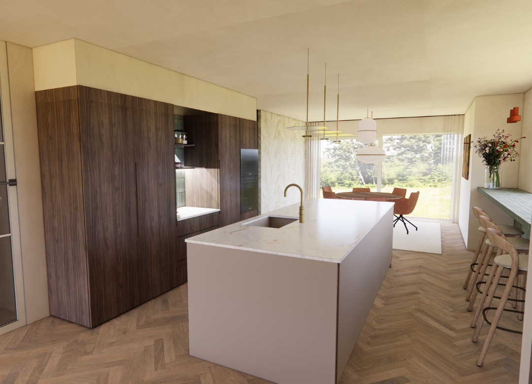Als aanvulling hierop ontstond de keukenbar. Een element dat Simone en Axel zelf niet hadden bedacht, maar dat nu een vanzelfsprekende plek krijgt in hun dagelijks leven. Niet als blikvanger, maar als functionele overgang tussen koken en leven. Een plek voor een ontbijt, een kort moment tussendoor, zonder dat het onrust brengt. Terwijl er optimaal een connectie is met binnen en buiten.